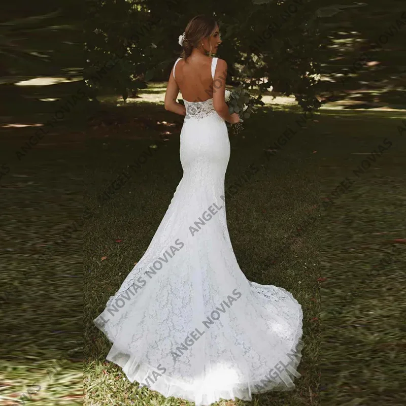 Long Mermaid White Full Lace Boho Wedding Dresses with Slit Scoop Neckline Bridal Party Gown Vestidos De Novia Customized